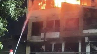 माॅडल टाउन के गुजरांवाला क्षेत्र में चार मंजिला मकान में लगी आग बुझाते हुए दमकल कर्मचारी। वीडियो ग्रैब