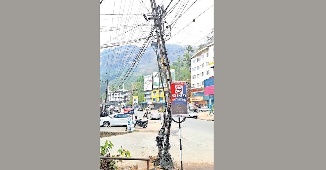 ഇതു കണ്ടിട്ട് അപകടമാണെന്ന് തോന്നുന്നില്ലേ? ടൗണിൽ ഭീഷണി ഉയർത്തി 11കെവി വൈദ്യുത പോസ്റ്റ്