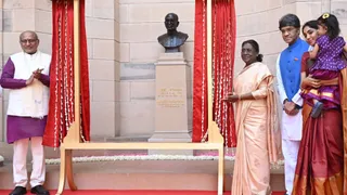 राष्ट्रपति द्रौपदी मुर्मु ने राष्ट्रपति भवन में चक्रवर्ती राजगोपालाचारी की मूर्ति का अनावरण किया। (फोटो सौजन्य- @rashtrapatibhvn)