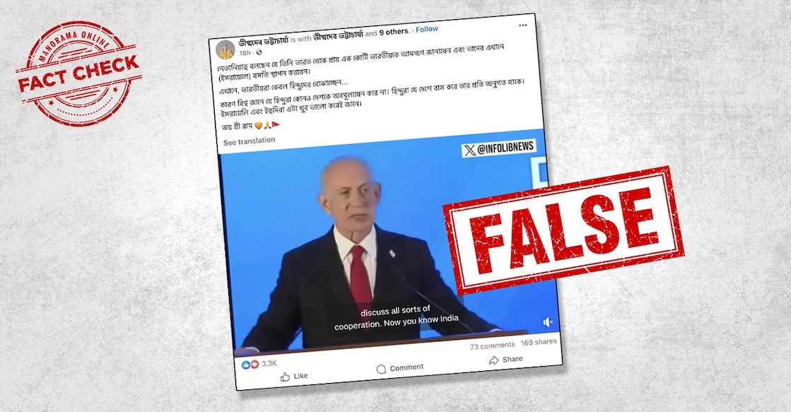 നെതന്യാഹുവിന്റെ 40 സെക്കൻഡ് നീളുന്ന വൈറൽ പ്രസംഗത്തിൽ ഒരിടത്തും ഇസ്രയേലിൽ സ്ഥിരതാമസമാക്കാൻ ഇന്ത്യക്കാരെ ക്ഷണിക്കുന്നതായി അദ്ദേഹം പറഞ്ഞിട്ടില്ല. ‘അടുത്തയാഴ്ച ആരാണ് ഇവിടെ വരുന്നതെന്ന് നിങ്ങൾക്കറിയാം? നരേന്ദ്ര മോദി. ഇസ്രായേലും ഇന്ത്യയും ഒരു വലിയ സഖ്യത്തിലാണ്. എല്ലാത്തരം സഹകരണത്തെക്കുറിച്ചും ഞങ്ങൾ ചർച്ച ചെയ്യും. ഇന്ത്യ ഒരു ചെറിയ രാജ്യമല്ല. അവർക്ക് 1.5 ബില്യൺ ജനസംഖ്യയുണ്ട്. ഇന്ത്യയിൽ ഇസ്രായേലിന്റെ ജനപ്രീതി കുതിച്ചുയരുകയാണ്. നിങ്ങൾക്കറിയാമോ? ശരി, നിങ്ങൾക്കറിയാമോ. നിങ്ങൾ അറിയുന്നത് നല്ലതാണ്. പക്ഷേ നിങ്ങൾ ഇത് അറിയണമെന്ന് ഞാൻ ആഗ്രഹിക്കുന്നു. കൂടാതെ, ഒന്നിനുപുറകെ ഒന്നായി, മറ്റ് നിരവധി രാജ്യങ്ങൾ ഞങ്ങളിലേക്ക് വരുന്നു,’ എന്നാണ് ഈ വിഡിയോയിൽ അദ്ദേഹം പറഞ്ഞതിന്റെ വിവർത്തനം. ADVERTISEMENT Go AD-FREE