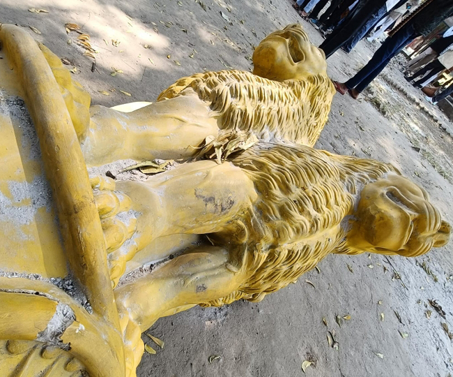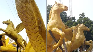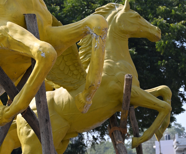 दामोदर स्वरूप पार्क के पास बनायी जा रही है रोटरी पर लगाए जा रहे हैं घोड़े के क्षतिग्रस्त पंख। जागरण