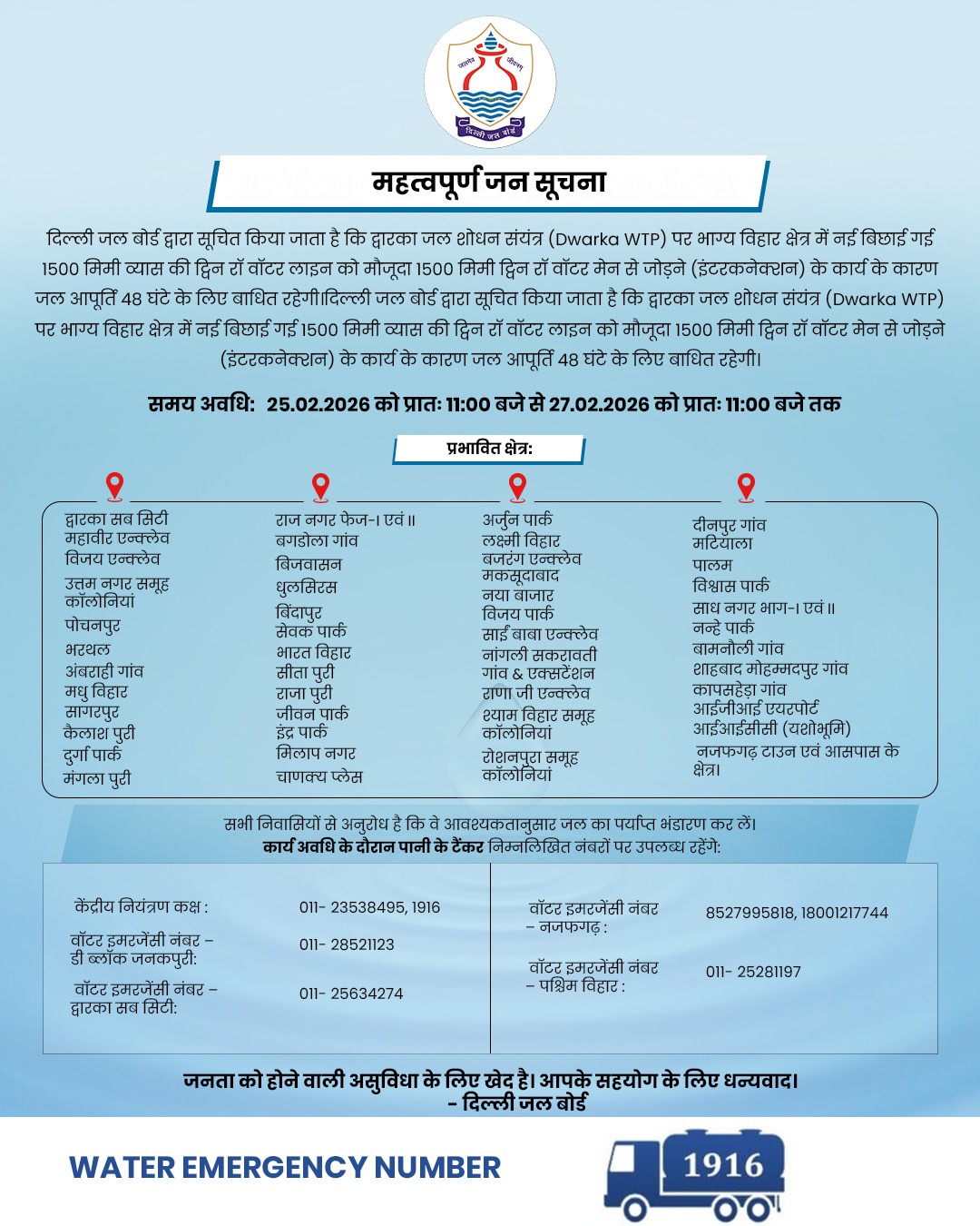 इस वजह से द्वारका और आसपास के कई इलाकों में पानी की सप्लाई पूरी तरह बंद या बहुत कम दबाव वाली रहेगी। प्रभावित क्षेत्रों में द्वारका सब सिटी, महावीर एन्क्लेव, विजय एन्क्लेव, उत्तम नगर कॉलोनियां, पूछनपुर, लक्ष्मी विहार, बिजवासन, छावला, गोयला डेयरी, नांगलोई, मटियाला, पालम, कापसहेड़ा, नजफगढ़ टाउन और आसपास के गांव, धूलसीरस, ककरोला, उतम नगर, विकासपुरी, राजपुर, मदनगीर, आनंद विहार, श्याम विहार, नीलोठी, पश्चिम विहार, राजौरी गार्डन, आईजीआई एयरपोर्ट और यशोभूमि (आईसीसीसी) शामिल हैं।