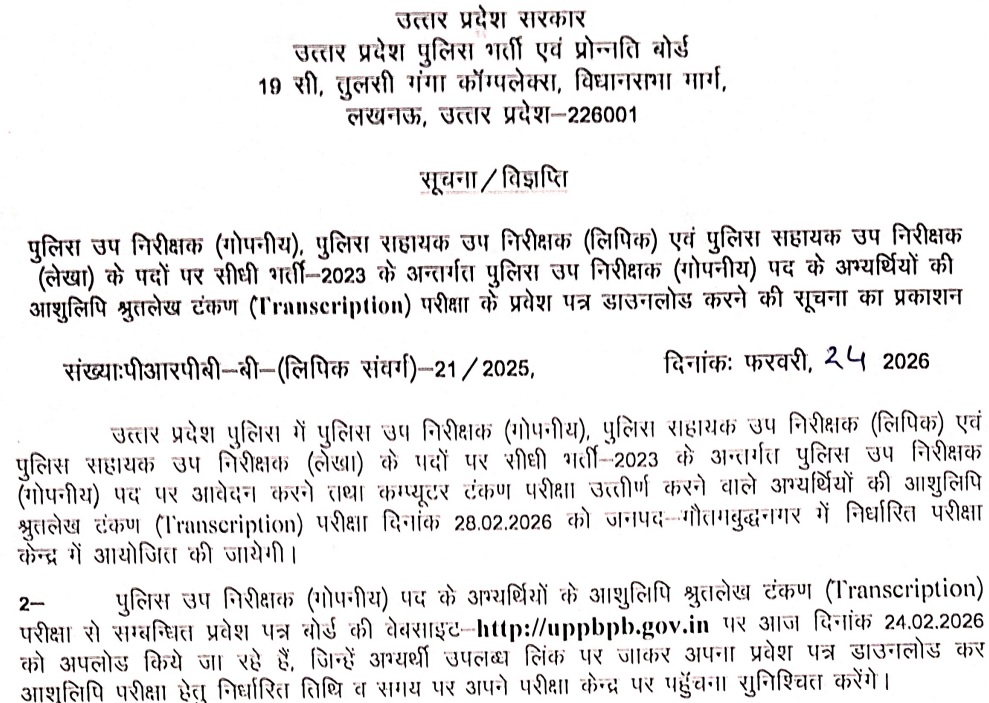UP Police SI Admit Card 2026: यूपी पुलिस एसआई एएसआई ट्रांस्क्रिप्शन परीक्षा के लिए एडमिट कार्ड जारी, एग्जाम 28 फरवरी को