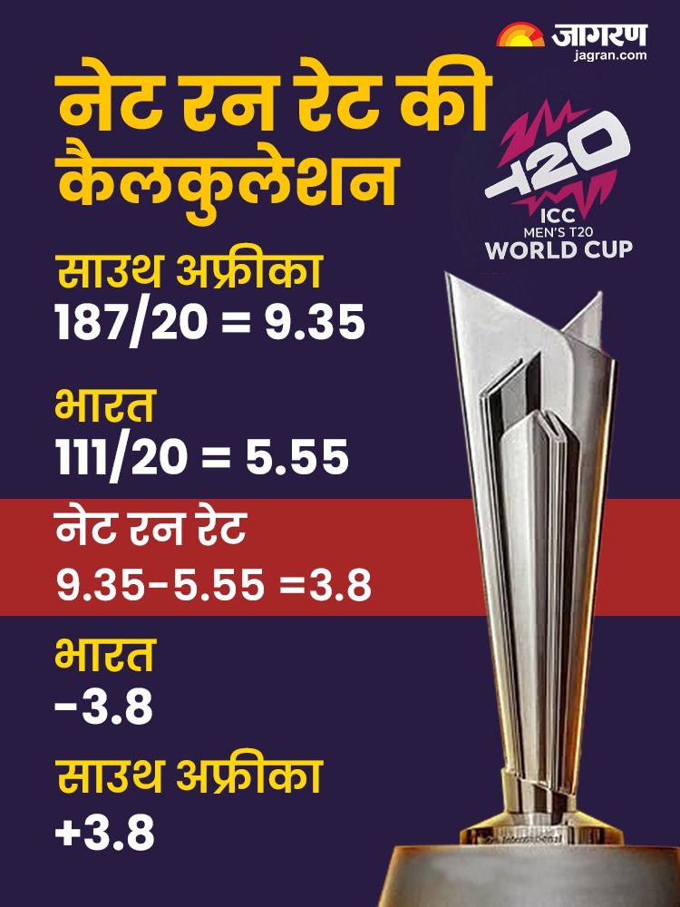 नेट रन रेट की कैलकुलेशन को हम भारत और साउथ अफ्रीका के बीच हुए सुपर-8 के पहले मैच से समझते हैं। इस मुकबले में साउथ अफ्रीका ने पहले बल्लेबाजी करते हुए 20 ओवर में 7 विकेट खोकर 187 रन बनाए। जवाब में भारतीय टीम 18.5 ओवर में 111 रन पर सिमट गई। भारतीय टीम ने अपने पूरे ओवर नहीं खेले, पर टीम ऑलआउट हुई।