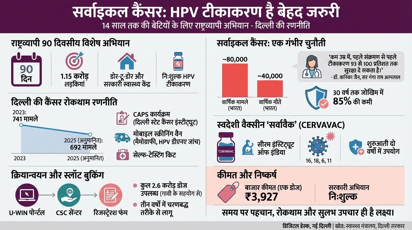 राजधानी दिल्ली में इस राष्ट्रीय अभियान को राज्य की कैंसर रोकथाम रणनीति से जोड़ा जा रहा है। सर गंगा राम अस्पताल की गायनेकोलॉजी एंडोस्कोपी विशेषज्ञ डॉ. कनिका जैन ने HPV वैक्सीनेशन कार्यक्रम को महिलाओं के स्वास्थ्य के लिए अत्यंत महत्वपूर्ण बताया।