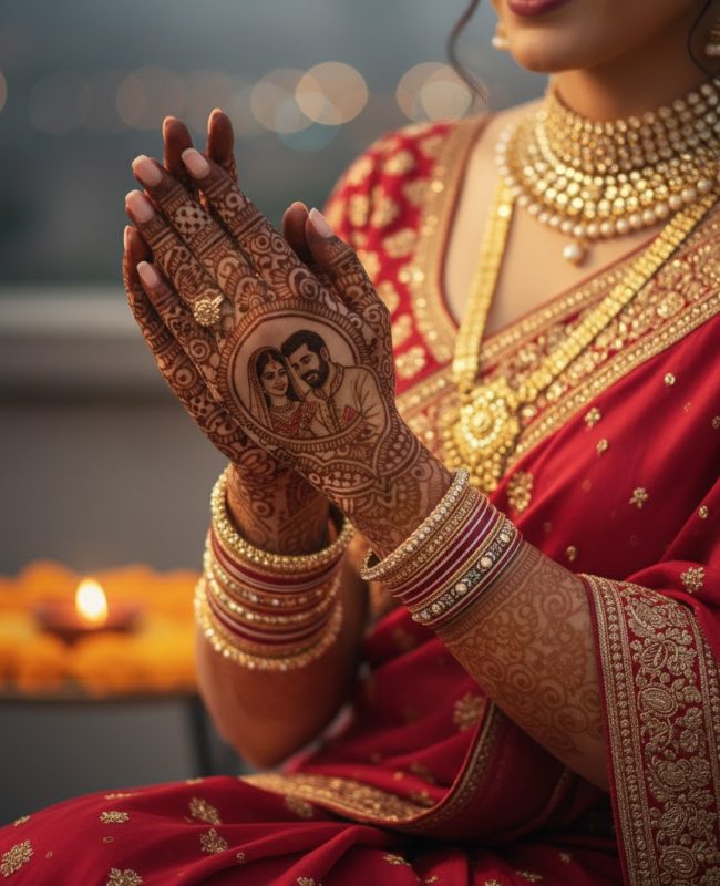 करवा चौथ के मौके पर हाथों पर करवा चौथ मनाते कपल की फोटो वाली डिजाइन सबसे ज्यादा चलन में रहती हैं। साथ ही कपल के चारों पर डिजाइन इसे और भी खास बना देती है। अगर आप भी फुल करवा चौथ वाला लुक लेना चाहती हैं, तो इस डिजाइन को जरूर लगाएं। ये दिखने में बेहद खूबसूरत और काफी क्लासी लगती है।
