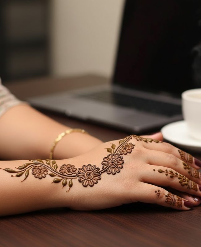 अगर आप एक वर्किंग वुमन हैं और आपके लिए मेहंदी की बड़ी और कठिन डिजाइन लगाने का समय नहीं है, तो आप 10 मिनट में लगने वाली इस डिजाइन को ट्राई कर सकते हैं। हाथों पर बनी यह डिजाइन न सिर्फ लगाने में आसान है, बल्कि देखने में भी खूबसूरत लगती है। हाथों में बनी फूल-पत्ती की बेल और उंगलियों के पोर पर भरी मेहंदी आपको खूबसूरत लुक देगी।