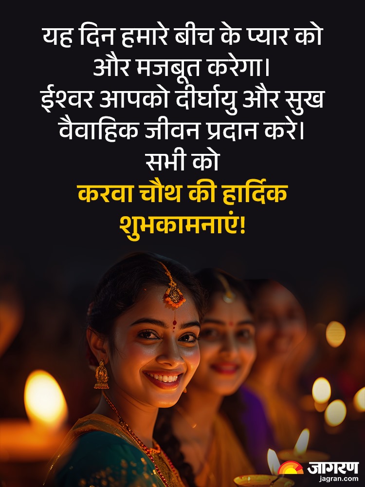 धर्म डेस्क, नई दिल्ली। हिंदू पंचांग के मुताबिक, हर साल कार्तिक माह में आने वाली कृष्ण पक्ष की चतुर्थी तिथि पर करवा चौथ का व्रत किया जाता है। ऐसे में यह व्रत इस बार शुक्रवार, 10 अक्टूबर को किया जा रहा है। इस दिन पर सुहागिन महिलाएं सुखी वैवाहिक जीवन और पति की लंबी उम्र की कामना के साथ निर्जला व्रत का पालन करती हैं। ऐसे में आप करवा चौथ के दिन अपने प्रियजनों को ये शुभकामना संदेश (Karwa Chauth greetings) भेजकर उनके लिए इस पर्व को और भी खास बना सकते हैं। विज्ञापन हटाएं सिर्फ खबर पढ़ें