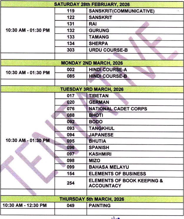 10th क्लास का पहला पेपर मैथमेटिक्स विषय का होगा वहीं आखिरी पेपर विभिन्न भाषा विषयों का होगा। कक्षा 12वीं का पहला पेपर 17 बायोटेक्नलॉजी, एंटरप्रेन्योरशिप, शॉर्टहैंड इंग्लिश, शॉर्टहैंड हिंदी का आयोजित होगा वहीं अंतिम पेपर संस्कृत कोर, मल्टीमीडिया, डाटा साइंस विषय का होगा।