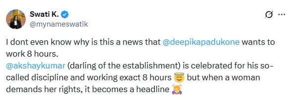 I dont even know why is this a news that @deepikapadukone wants to work 8 hours. @akshaykumar (darling of the establishment) is celebrated for his so-called discipline and working exact 8 hours but when a woman demands her rights, it becomes a headline ️ https://t.co/VhBy1X7G0O pic.twitter.com/3c0aG4Lnw9 — Swati K. (@mynameswatik) October 10, 2025
