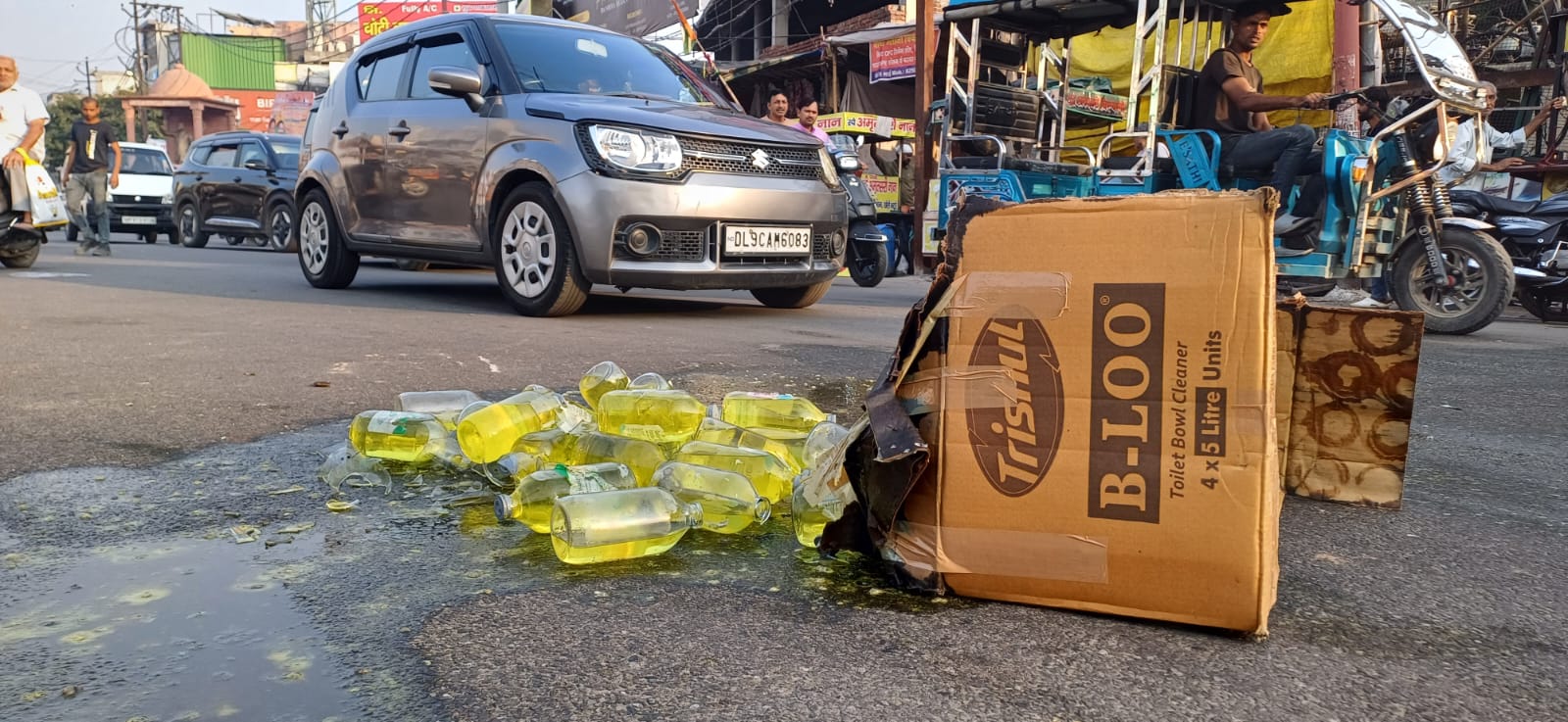 शहर के अतरपुरा चौक पर शनिवार शाम को हड़कंप मच गया। वहां पर एक तेज रफ्तार बाइक एकाएक कार के सामने आ गई। बाइक सवार ने एक गत्ते की पेटी लादी हुई थी। कार की टक्कर से बाइक सड़क पर गिर गई। इसके साथ ही गत्ते की पेटी में से गिरकर तेजाब की बोतल फटने लगीं।