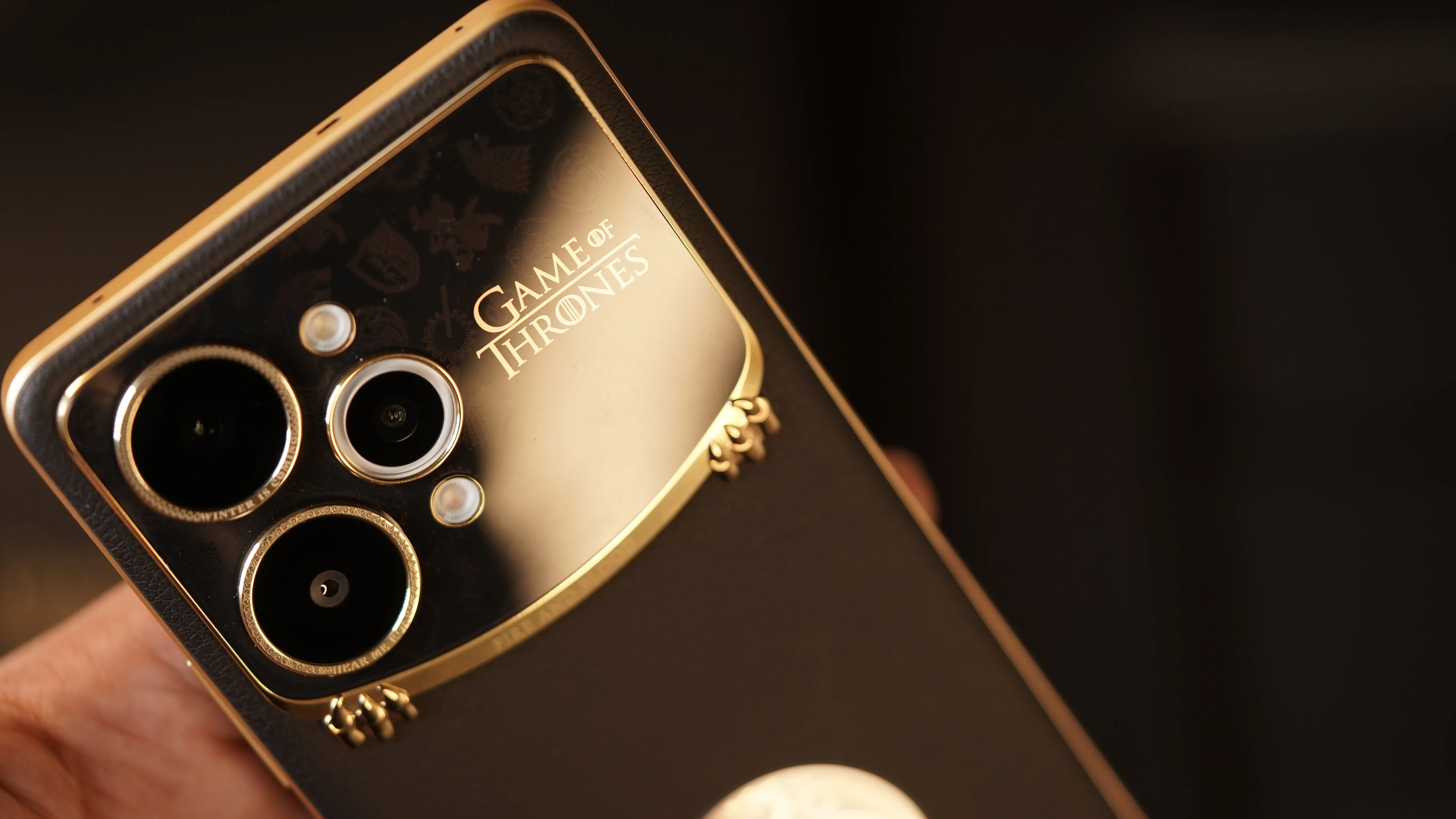 The camera lens rings are engraved with House mottos: WINTER IS COMING (House Stark) and “HEAR ME ROAR” (House Lannister). Below the camera, a gilded 3D frame is engraved with the Targaryen motto, FIRE AND BLOOD.
