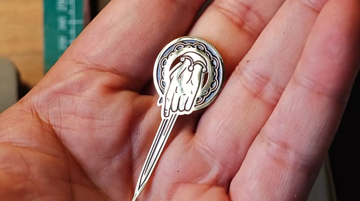 A physical, wearable replica of the King's Hand pin, inspired by the one worn by various hands of kings like Tyrion Lannister, Eddard Stark, and the ones before them. This item serves a technical function as well, i.e., it acts as a sim tray tool as well as a collectable piece of fan merchandise.