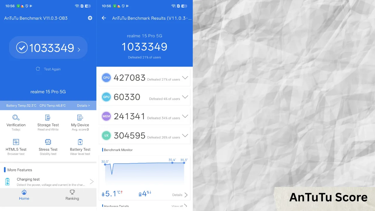 One of the standout aspects of the Realme 15 Pro’s performance is its thermal control. Equipped with a large 7,000 square millimetre vapour chamber cooling system, the phone maintains cooler temperatures even under sustained load. In the Burnout CPU throttle test: