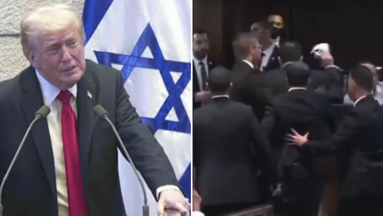 Aymen Odeh and Ofer Cassif, two left-wing lawmakers belonging to a joint Palestinian-Israeli political party, were ejected from parliament during President Trump's speech for displaying signs that said “Recognize Palestine”.