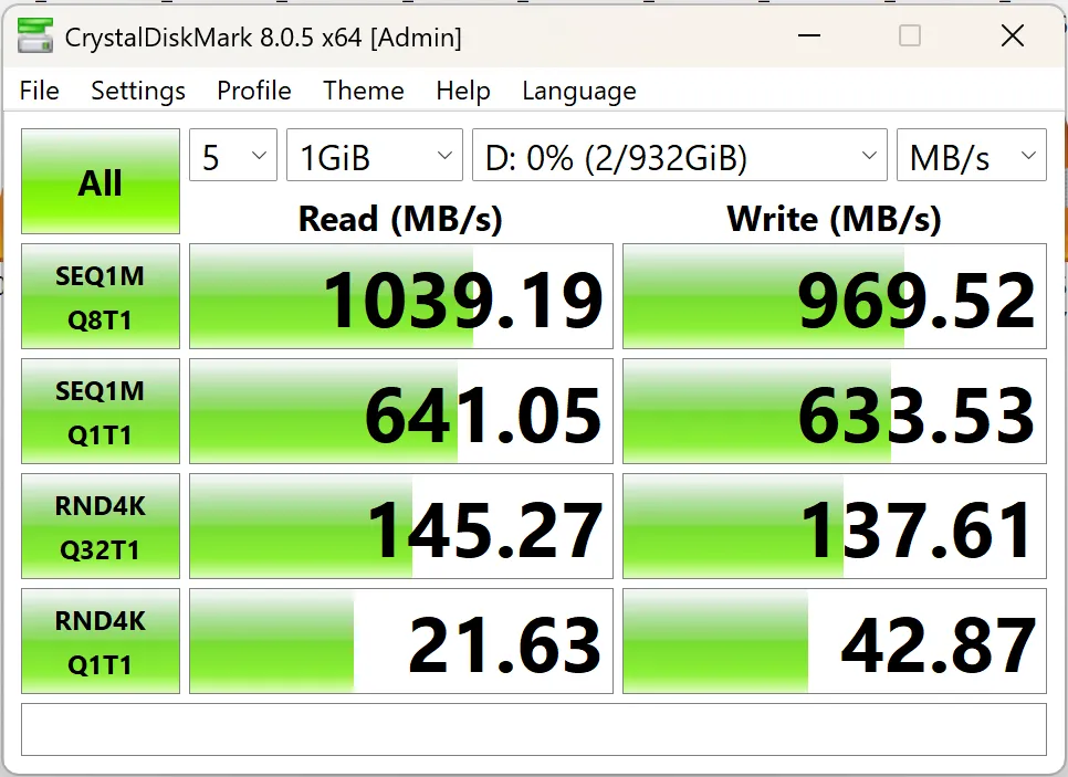 • Uses USB 3.2 Gen 2x2 protocol for high-speed data transfer, with read speeds exceeding 1 GB/s and write speeds approaching 1 GB/s.