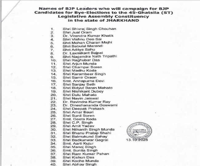 केंद्रीय नेतृत्व द्वारा जारी सूची में केंद्रीय मंत्री शिवराज सिंह चौहान, जुएल उरांव, अन्नपूर्णा देवी और संजय सेठ जैसे दिग्गज नेताओं के नाम शामिल हैं।